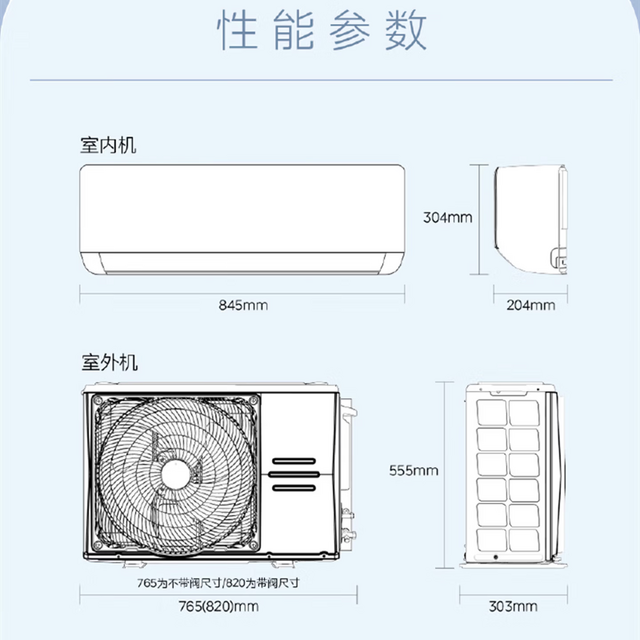 | 内机机身尺寸(宽×高×深)mm | 深204mm 高304mm 宽845mm | |